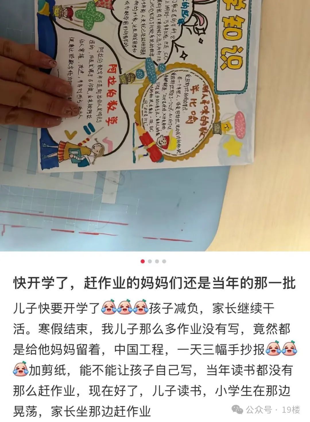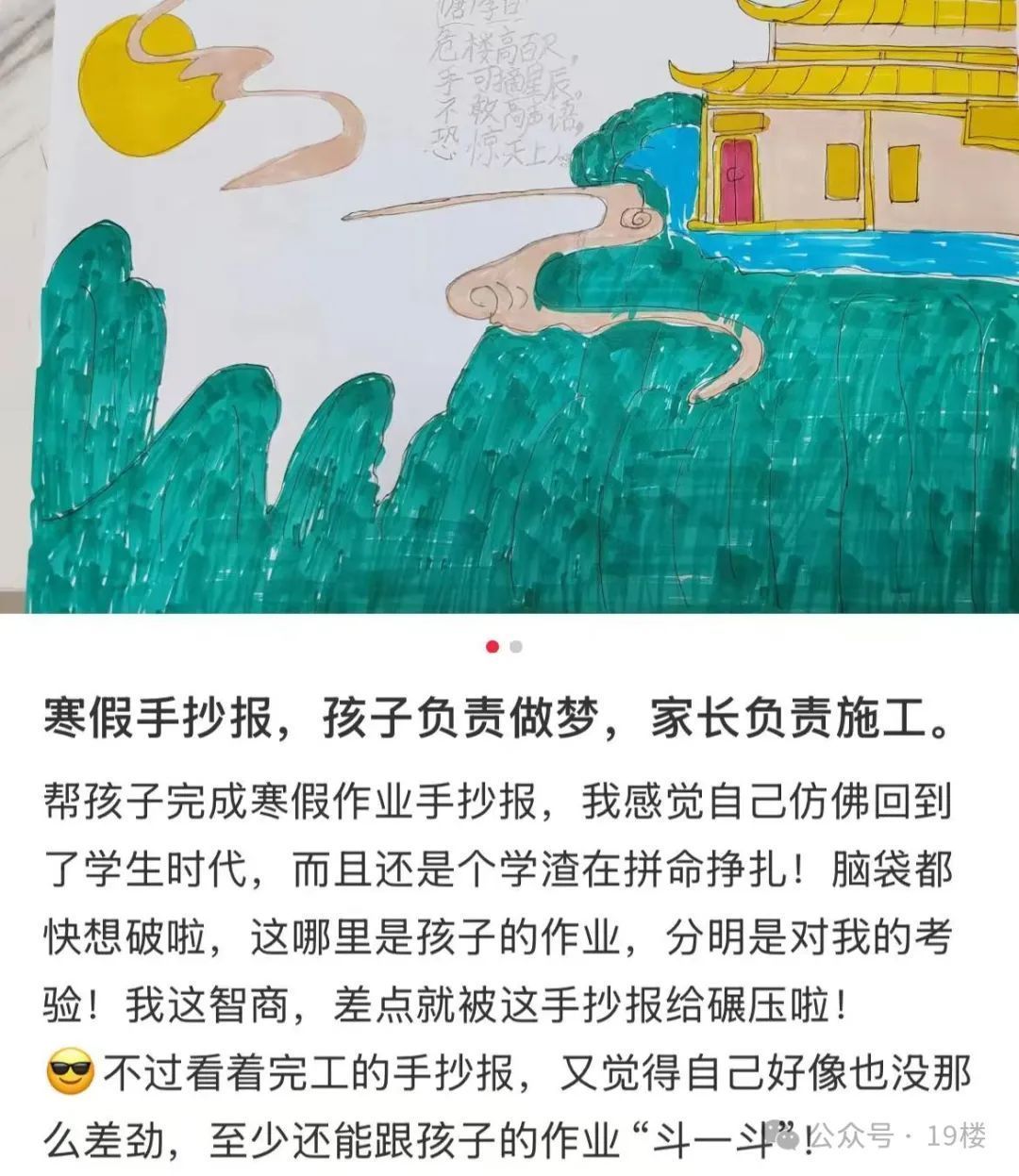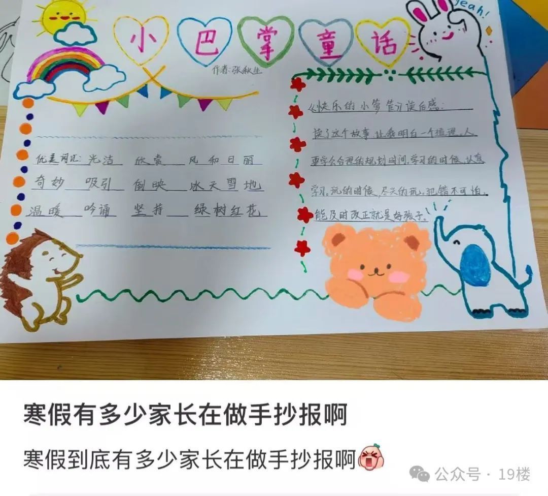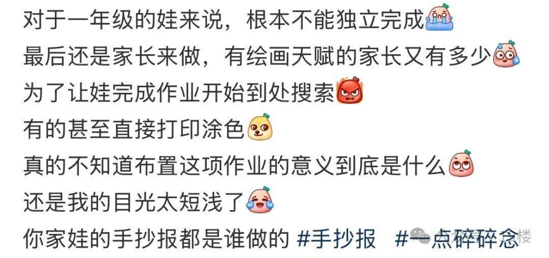 社交平台上,不少网友纷纷晒出熬夜做手抄报的经历。有网友更是直接表示仿佛回到了学生时代,“我感觉自己仿佛回到了学生时代,而且还是个学渣在拼命挣扎!脑袋都快想破啦,这哪里是孩子的作业,分明是对我的考验!”
